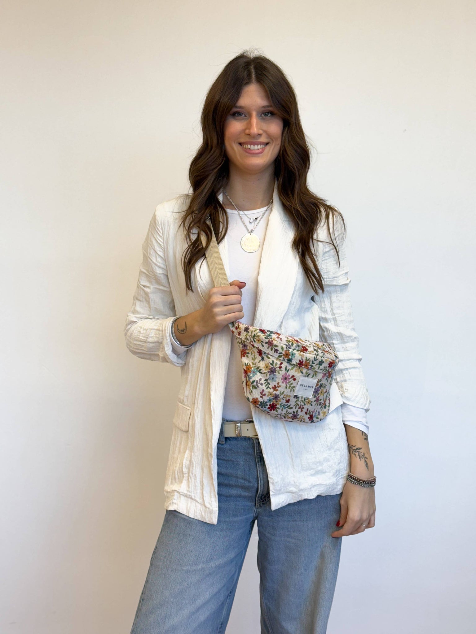 Fanny Pack with an adjustable long strap made of beige cotton webbing. Made from a beautiful thick jacquard fabric with a floral print on a beige background.